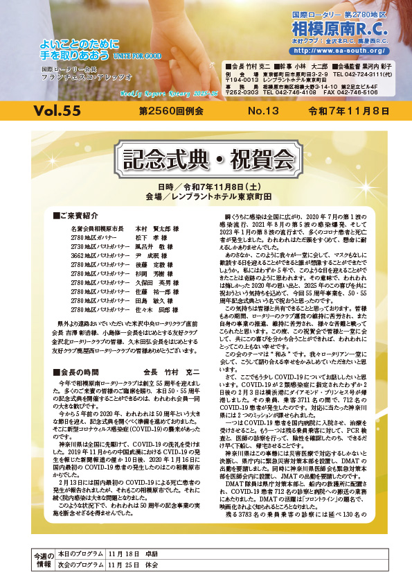 第2560回例会 週報 令和7年11月8日(記念式典・祝賀会号)