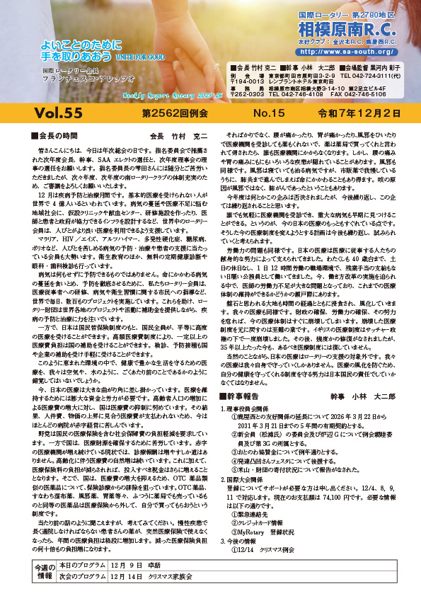 第2562回例会 週報 令和7年12月2日 を掲載しました
