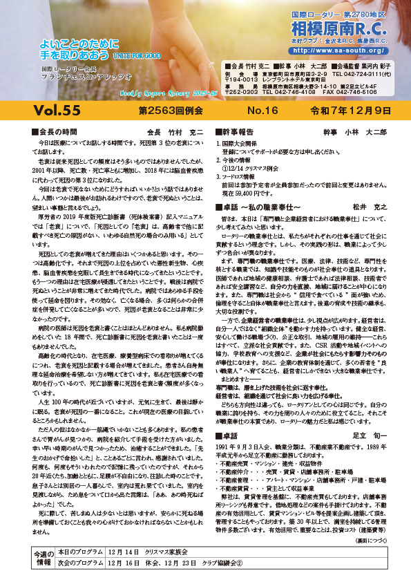 第2563回例会 週報 令和7年12月9日 をクラブ会報ページに掲載いたしました。