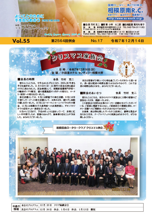第2564回例会 週報 令和7年12月14日 をクラブ会報ページに掲載いたしました。